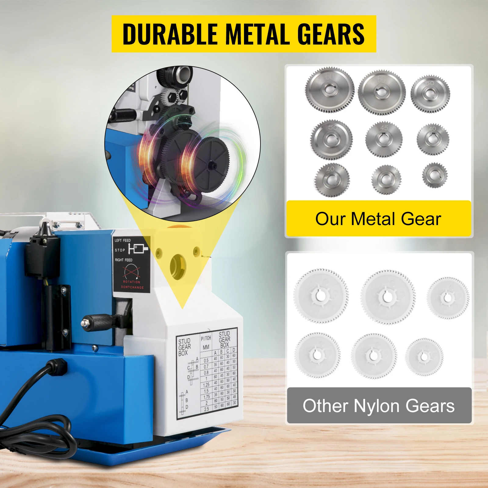 Upgrade Design: This small metal lathe uses metal gear instead of a nylon one. Aluminum handwheel can increase service life. Automatic power-off protection switch to make it safer. An extra LED lamp can help you finish processing in places with insufficient light.